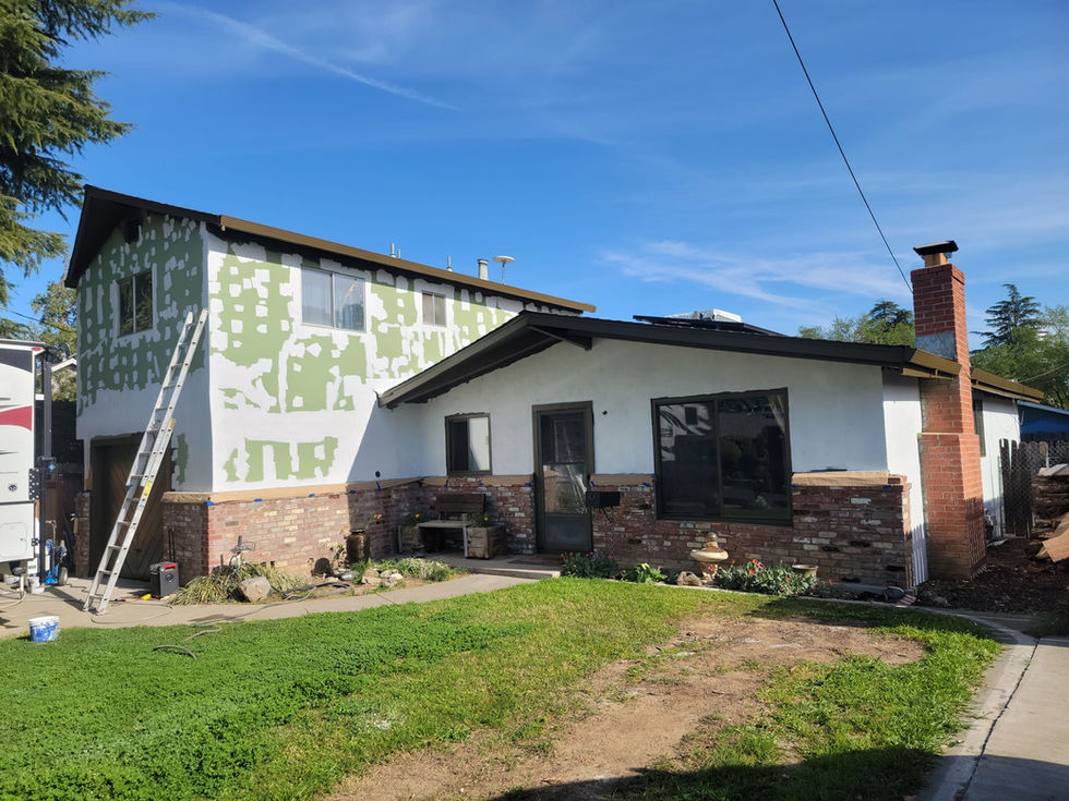 This project highlights a charming house exterior with unique architectural features, including a two-story house with brick and beige exterior.